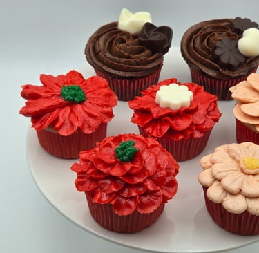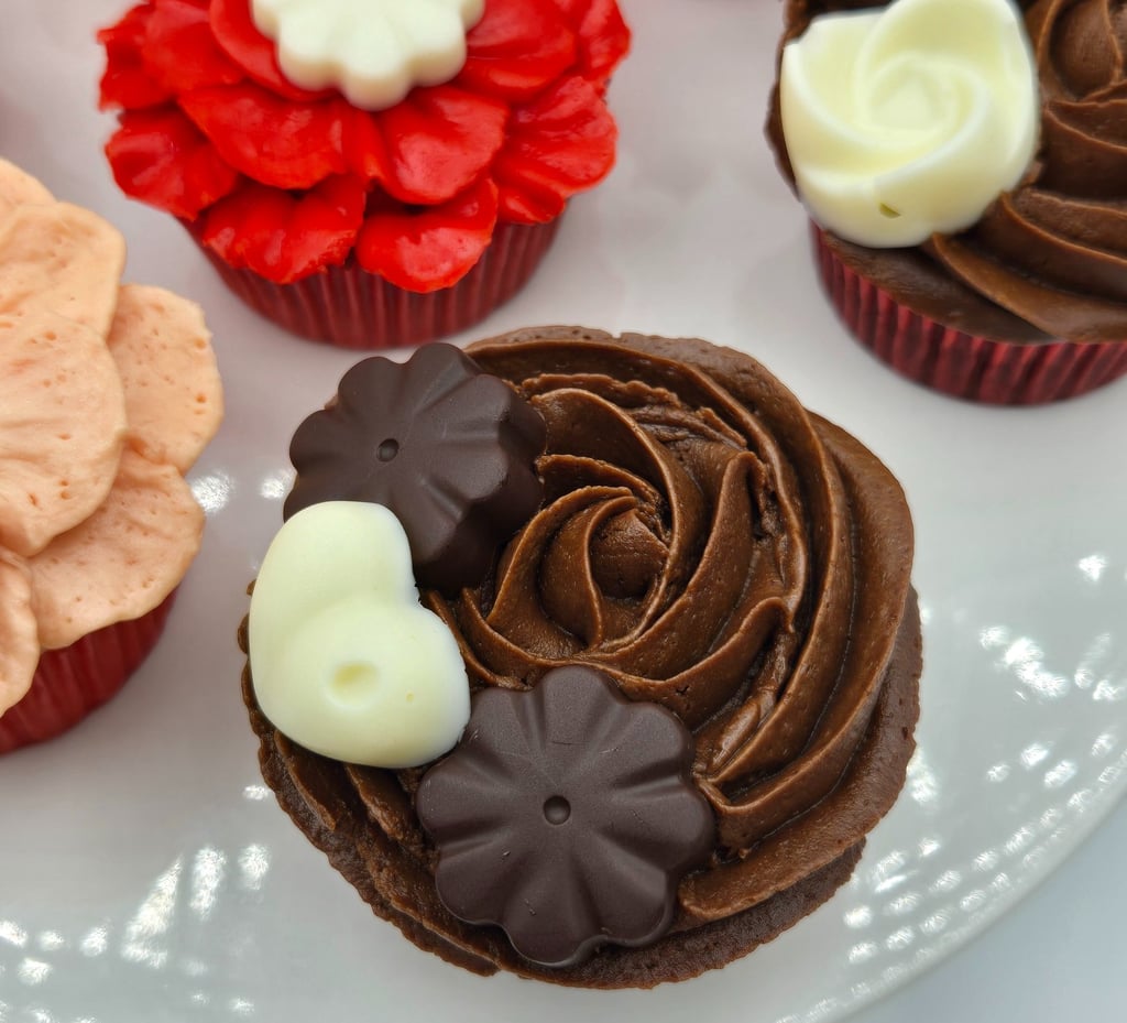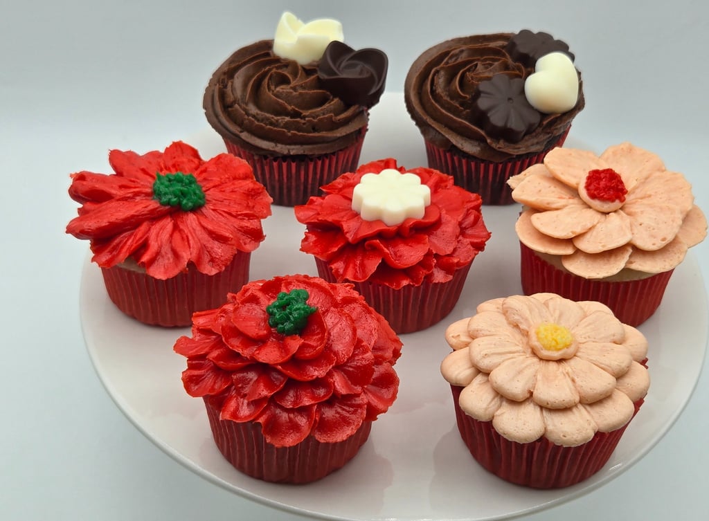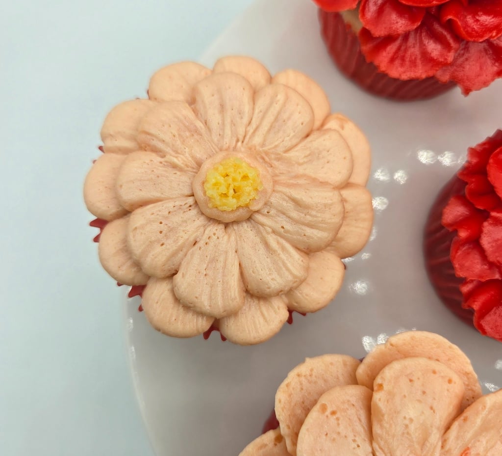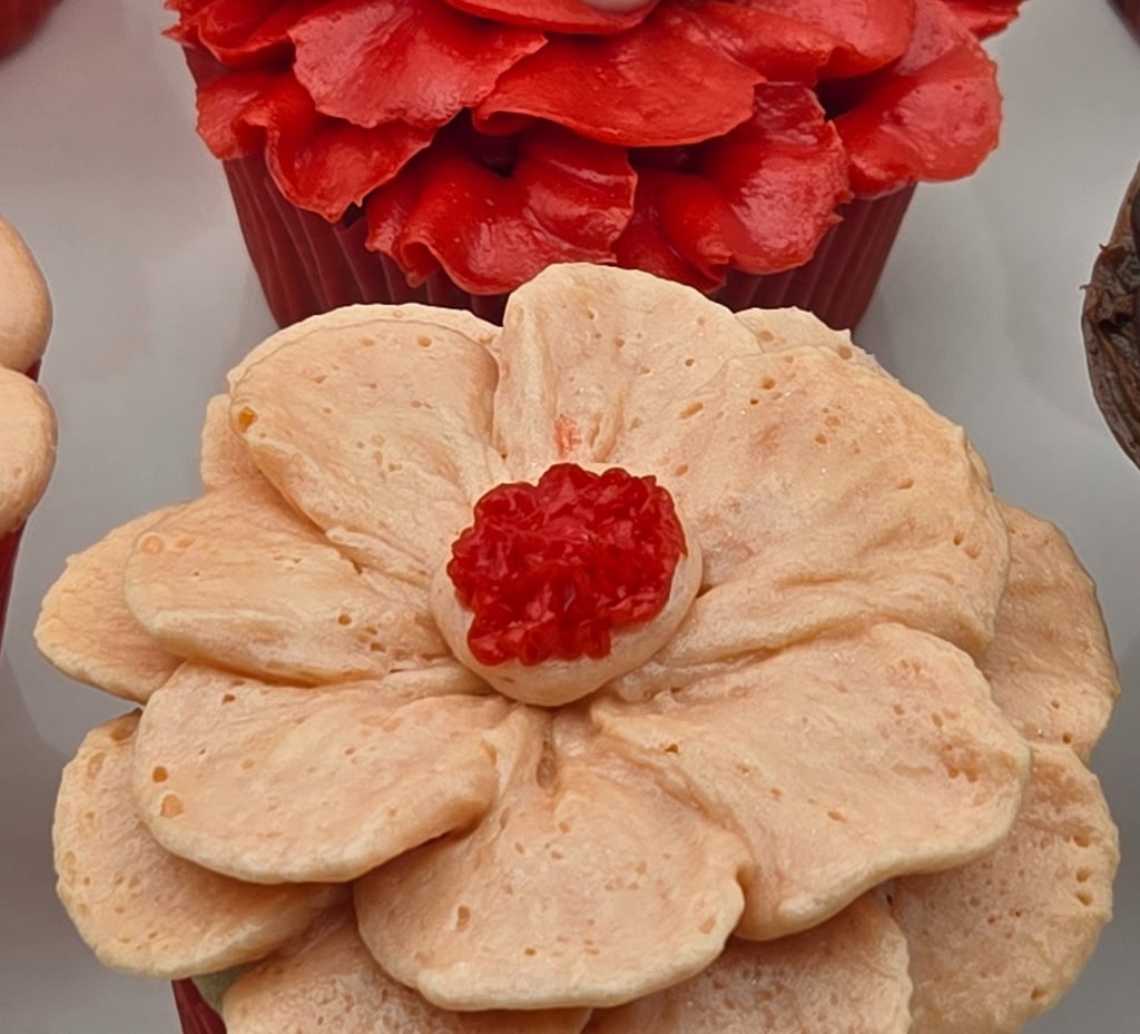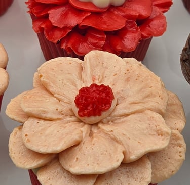 Creating these designs is all about patience, precision, and a little creativity. The petals are piped individually, building up layer after layer for fullness and dimension. A pop of color in the center—be it green, yellow, or a touch of textured chocolate—finishes each bloom. The choice of red and peach tones adds warmth and charm, making these cupcakes perfect for weddings, birthdays, or even as a thoughtful edible gift.